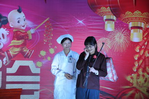 2月13日晚举行的元宵文娱晚会在医保股赖建平股长的《葫芦庙》潮剧选段中拉开帷幕。医、技、药、护和行政后勤各科室纷纷表演了舞蹈、合唱、小品、魔术、朗诵等不同类型的节目。经评选,医保股赖建平股长的《葫芦庙》潮剧选段、院部舞蹈《春天的芭蕾》和《年年有余》获得特别奖,内三科巫倩英的诗歌朗诵《白衣礼赞》获得一等奖,外一科、ICU陈琼如、陈晓珊的舞蹈《Bberibbom Bberibbom》和内六科黄维霞等的小品《回家过年》、五官科刘剑峰、许志航的合唱《王妃》获得二等奖,外二科陈育展的独唱《莫斯科郊外的晚上》、内八科杨南然的吉他伴唱《老男孩》和急诊科陈丽虹等的舞蹈《惊鸿舞》获得三等奖。