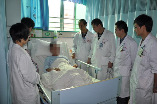 内科副主任陈宋璋、石兵和医生们在研究病人病情。