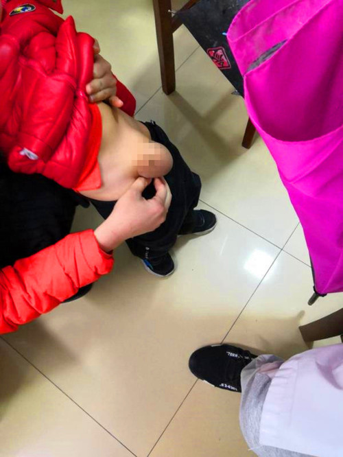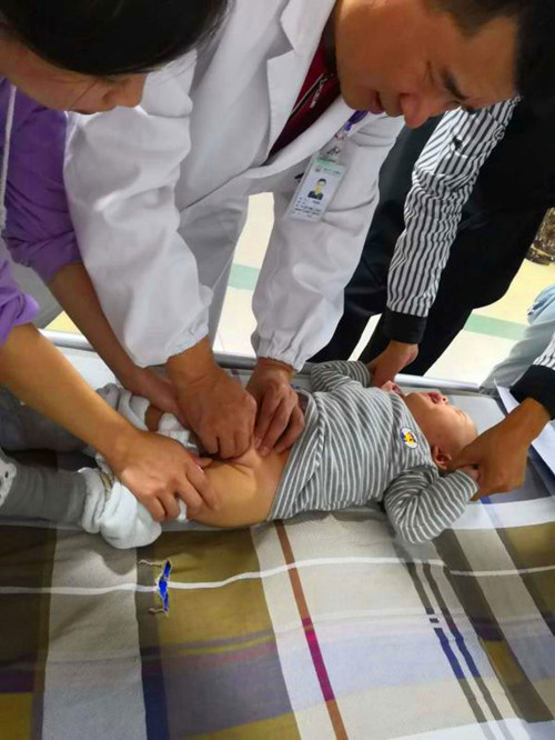 如果家长发现自家小孩有疝气的发生,需要立马就诊送医。可复性腹股沟斜疝症状一般较轻,也可自行回纳。而超过时间不能自行回纳,就要警惕嵌顿疝,嵌顿疝如处理不及时,可出现疝内容(多为网膜或肠管)的绞窄坏死,愈后相当严重。所以及时送医非常关键!而对于不能自行回纳的患儿,来就诊的第一步就是手法复位,让疝容物收回腹腔,减少肠梗阻、肠坏死的风险。下图为小儿外科专家许沈南副主任医师为患儿手法复位。许沈南副主任医师的疝气复位手法娴熟,操作果断,减少了患儿不必要的痛苦。