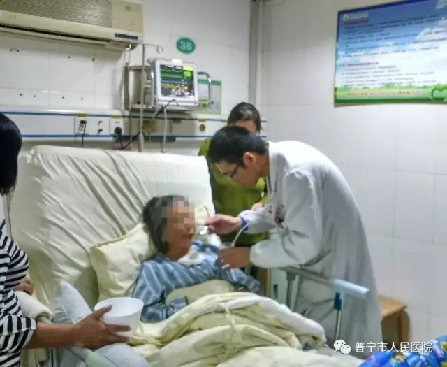 这件事一直牵着家人们的心,也牵着主管医生冯奕鑫的心。手术前,平易近人的冯医生耐心地跟阿婆讲解手术后的好处,鼓励及给予刘阿婆信心。吃饭之前都要和她聊一聊,疏解阿婆的情绪,排除她的顾虑,阿婆才会慢慢的吃上一点饭。常常在刘阿婆坚持不肯吃饭的时候,冯医生跟护士们便会接过家属手中的饭菜,亲自喂阿婆吃饭。