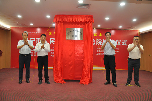 黄光胜(左三)、陈阳生(左二)、古新民(左一)、李杰烽(左四)共同为“普宁市人民医院医共体总院”揭牌。