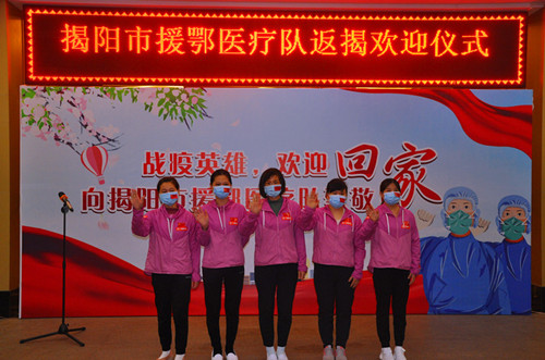 阳春三月,繁花锦簇,战士归来。经过60余个日夜的奋战,揭阳首批援鄂的普宁市人民医院神经内科黄妙珊、方乔、方洁玫、方瑜、温玉枝5名医疗队员圆满完成了支援使命,于3月31日晚平安返揭。揭阳市组织开展欢迎仪式迎接5名“白衣战士”回家。