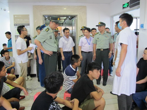 8月17日,省军区副司令员宋海巍大校在揭阳军分区司令员吴永忠大校、政治委员曹士阳大校的陪同下,到我院检查指导征兵体检工作。揭阳市委常委、我市市委书记张时义,我市市委常委、组织部长杨燕斌,我市政协副主席、我院院长陈阳生参加了活动。